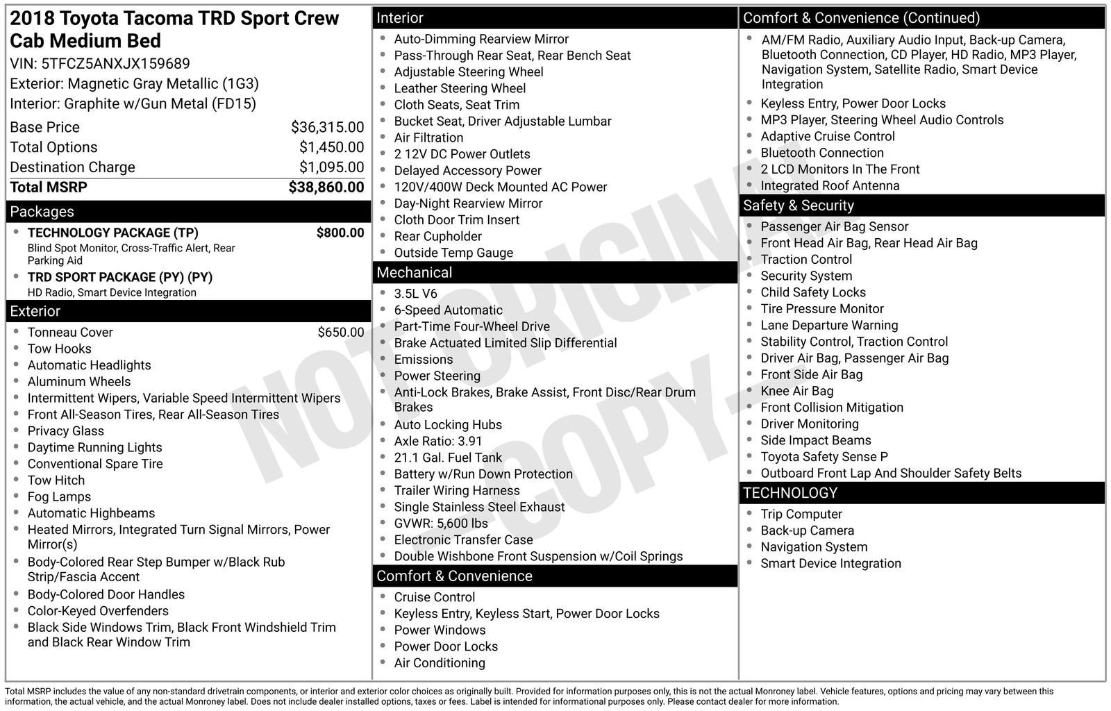Gray 2018 Toyota Tacoma TRD Sport V6 4WD 6-Speed 3.5L V6 PDI DOHC 24V LEV3-ULEV70 278hp